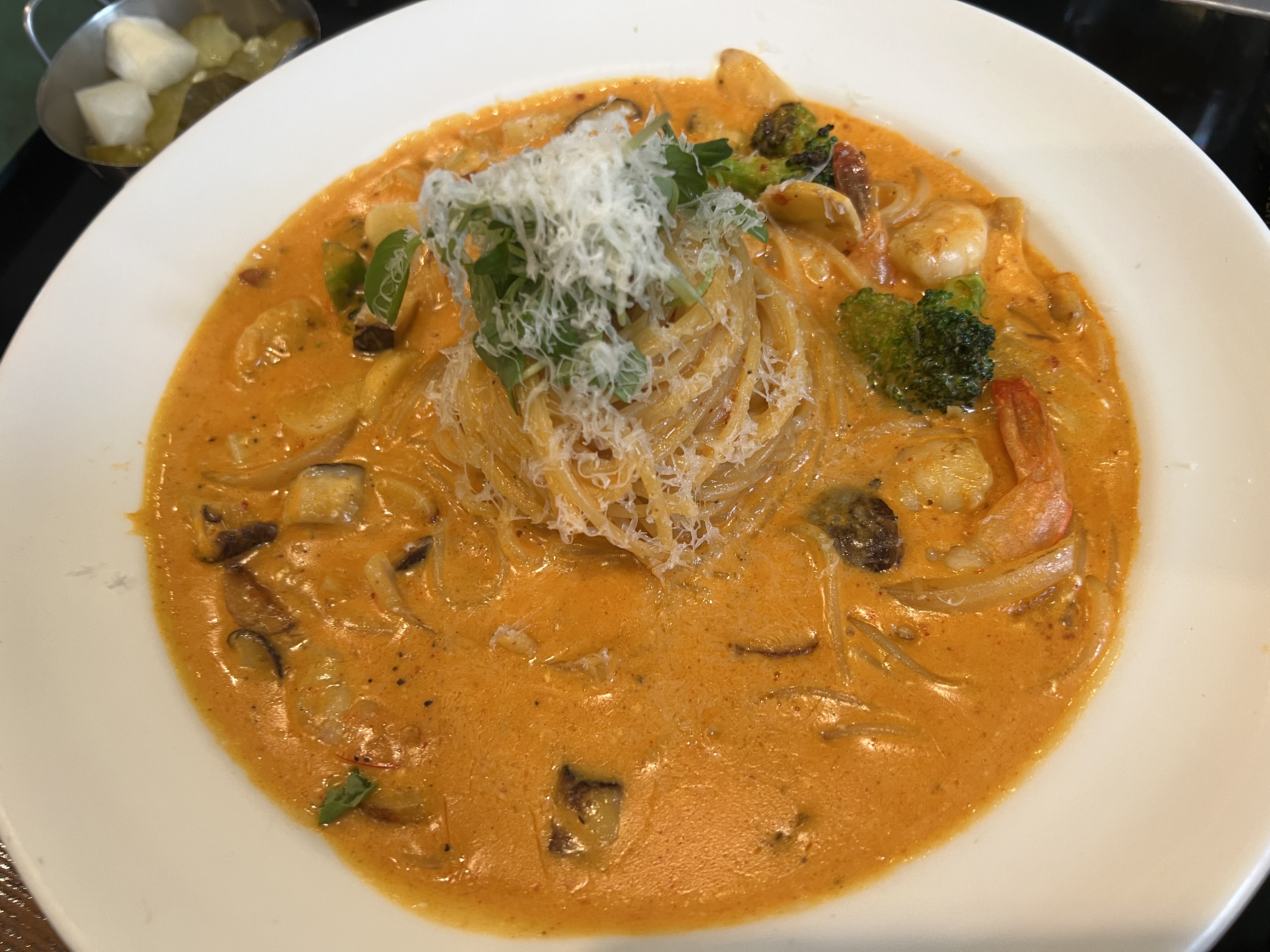 식감이 살아있는 홍게살이 들어간 파스타로서 리치한 로제 소스와 브로콜리가 들어가며 새우들도 함께 들어가서 맛있었습니다.