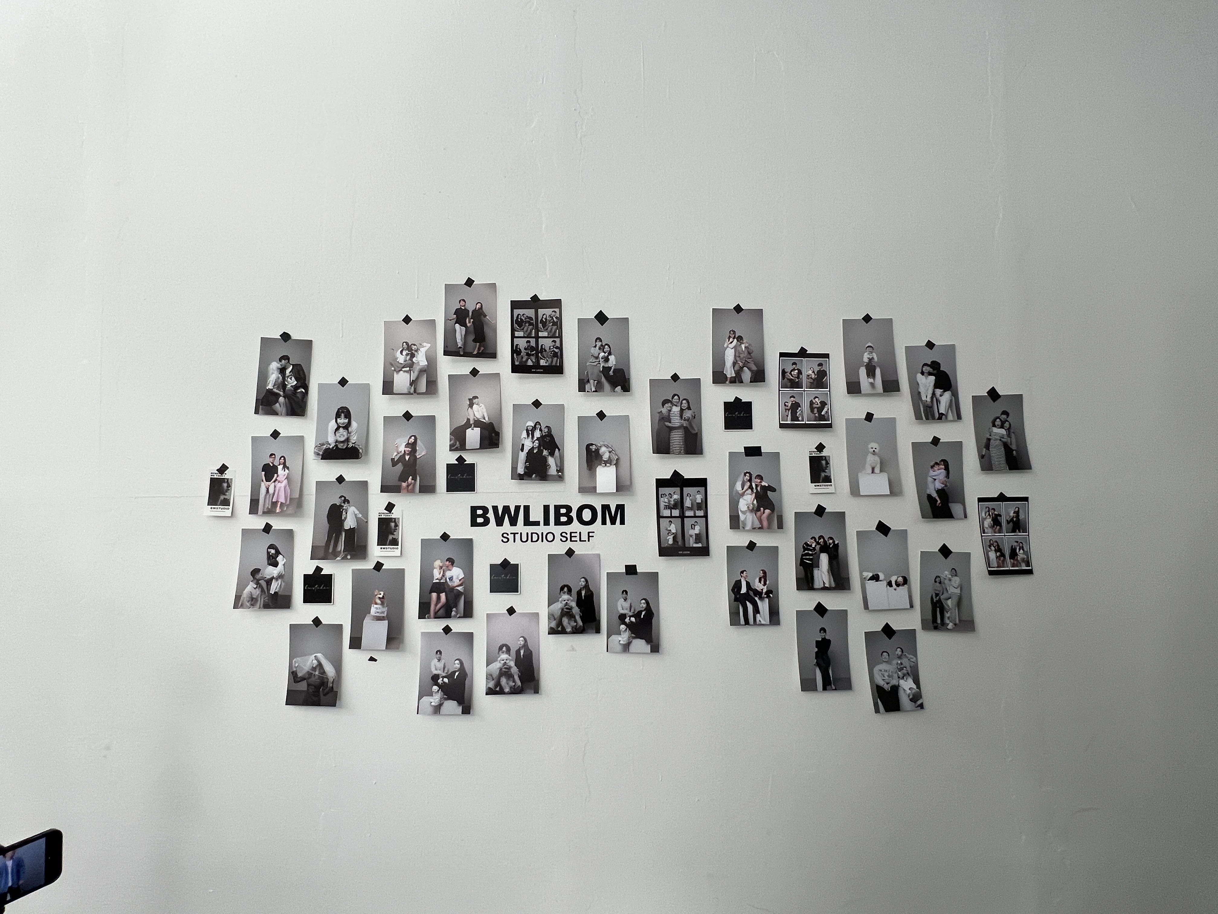 다양한 포즈로 찍은 사진들이 벽공간에 붙여져 있어서