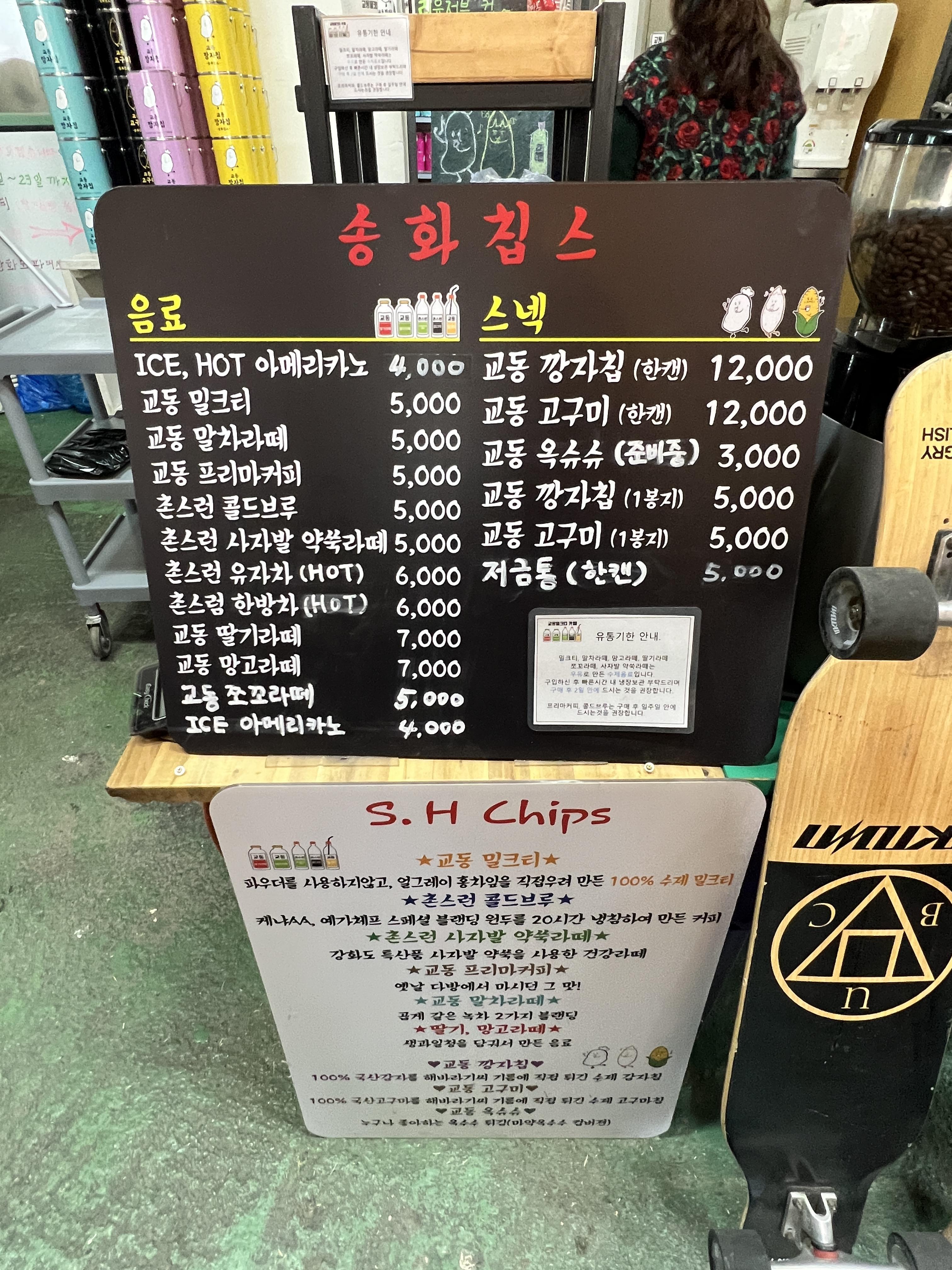 교동밀크티도 이곳에서 마실 수 있네요~ 다양한 음료와 스낵을 먹을 수 있는 송화칩스!